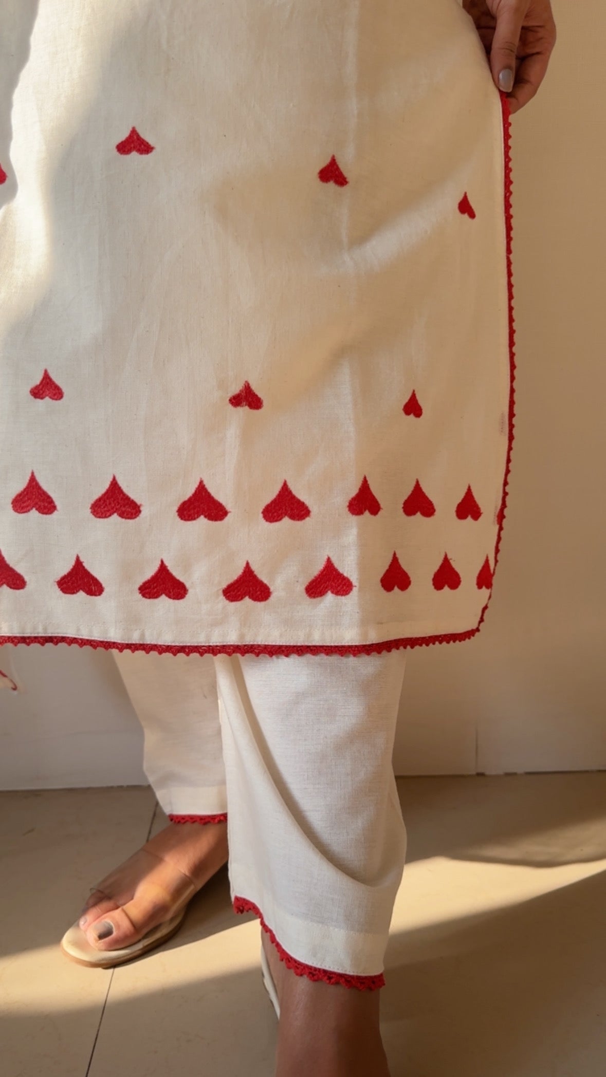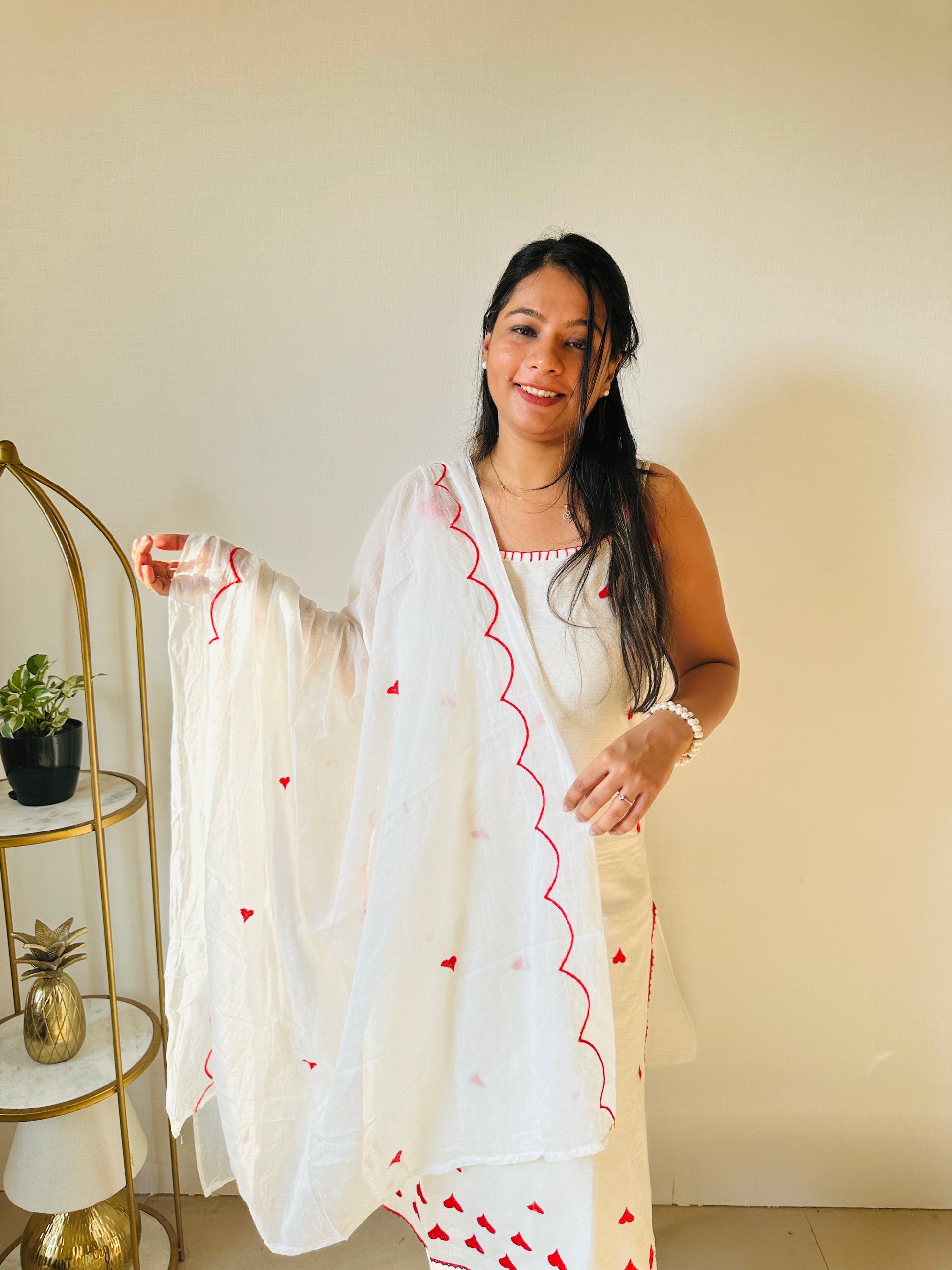 Chandni Dil is a charming white cotton suit adorned with a bold red heart, perfect for embracing the Karwachauth festivities. Its cute look and comfortable fit make it an ideal choice for women. Elevate your traditional wardrobe with this stylish piece.
